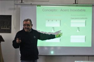 Nelson Ortega, Gerente de Operaciones de Acerinox, les enseñó a los estudiantes, los cuidados que se deben tener para poder extender su vida útil del acero y la existencia de diferentes tipos de de este material para diversos tipos de ambientes, por ejemplo, un acero inoxidable expuesto en una zona costera no es el mismo para una zona de valle, lo que sí tienen en común con otros aceros, es que se pueden soldar con diferentes formatos sin afectar su eficiencia, por ejemplo, en proceso TIG. Cabe destacar que el acero inoxidable puede soportar más de 800°C.