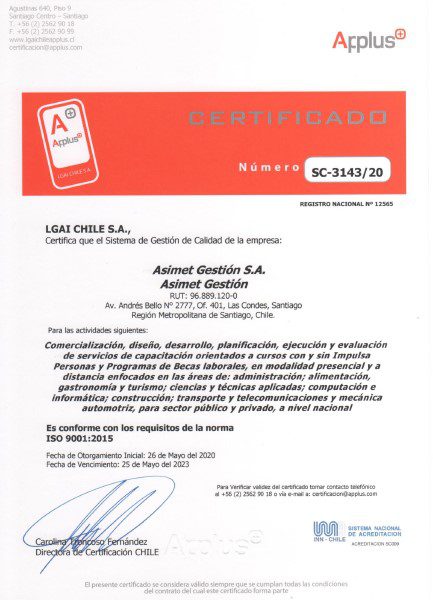 OTEC ASIMET, es el organismo técnico de capacitación reconocido por sence y certificado bajo ISO 9001-2015 Y Norma Chilena 2728-2015.