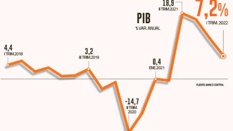 La desaceleración de la economía chilena quedo aún más en evidencia en el primer trimestre. Las Cuentas Nacionales publicadas ayer por el Banco Central mostraron que el Producto Interno Bruto (PIB) creció 7,2% frente a enero-marzo de 2021 y acusó una baja de 0,8% frente al último cuarto de dicho año.