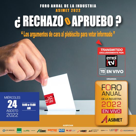 Es por ello que ASIMET lo invita a participar este 24 de agosto por el streaming de EMOL TV y T13.CL, del mayor encuentro industrial que se realiza en Chile, el Foro Anual de la Industria de Asimet 2022.