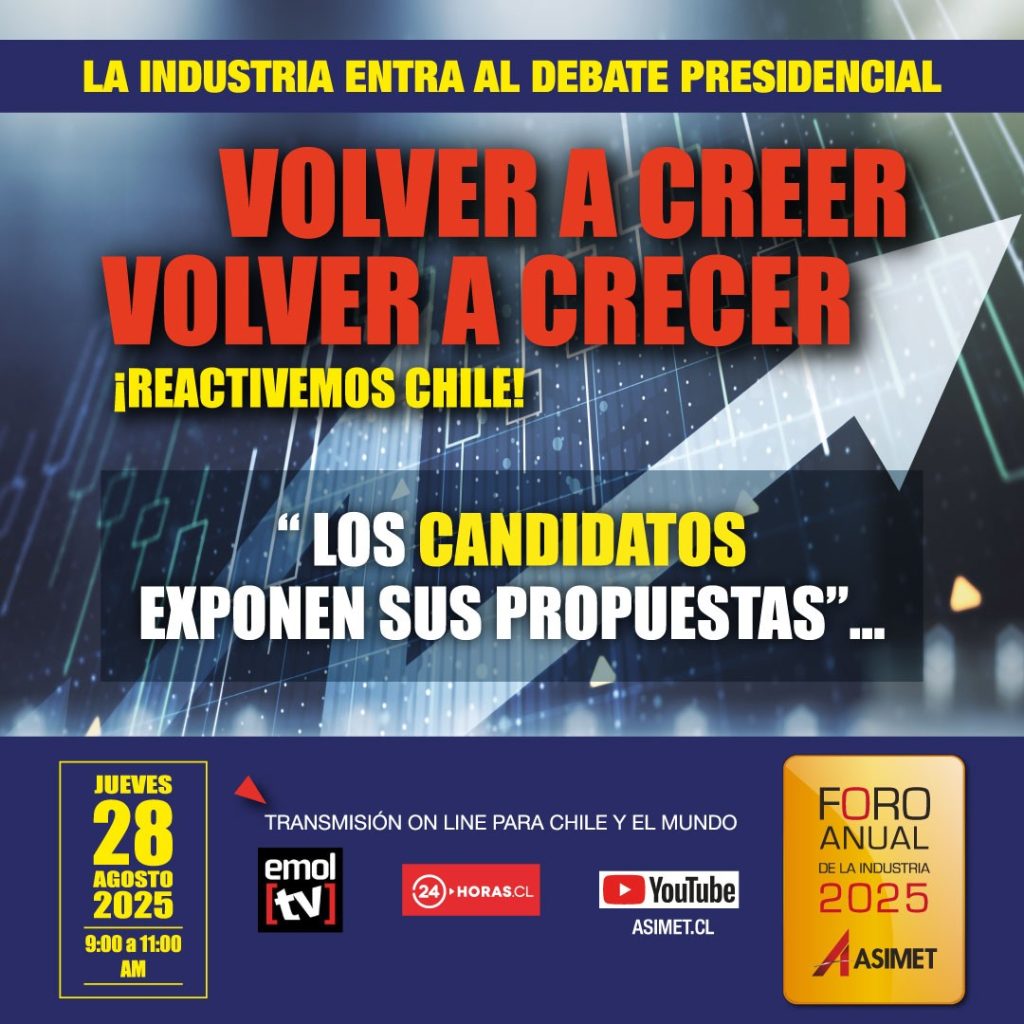Es por ello que ASIMET realizará este 29 de agosto vía streaming de EMOL TV y www.24horas.cl, el mayor encuentro industrial que se realiza en Chile, el Foro Anual de la Industria de Asimet 2025.