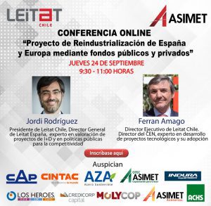 En el marco de la alianza entre Leitat y Asimet, invitamos a todos nuestros socios a participar de nuestra próxima charla online «Proyecto de Reindustrialización de España y Europa mediante fondos públicos y privados», en esta oportunidad contaremos con la participación en calidad de relatores de Jordi Rodríguez, Presidente de Leitat Chile, Director General de Leitat España, experto en valoración de proyectos de I+D y en políticas públicas para la competitividad y Ferran Amago, Director Ejecutivo de Leitat Chile, Director del CEN, experto en desarrollo de las empresas en proyectos tecnológicos y su adopción.