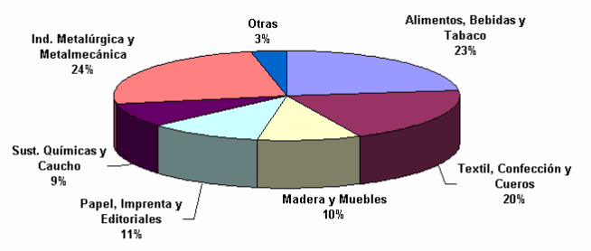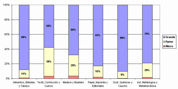 Cabe señalar que, en todos los sectores industriales, la pequeña y mediana empresa representa una proporción mayor al 20%. Donde se registra un mayor porcentaje de pymes es el químico, el que alcanza un 45% del total. Por su parte, un 36% de las industrias de alimentos y un 30% de las metalúrgicas-metalmecánicas son pequeñas y medianas.
