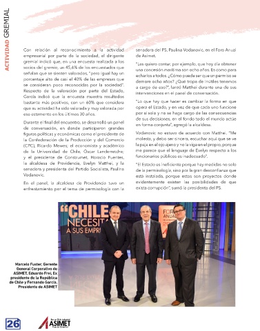 ACTIVIDAD GREMIAL Con relación al reconocimiento a la actividad senadora del PS, Paulina Vodanovic, en el Foro Anual
